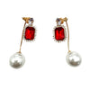 Elegant and fashionable gold plated sterling silver earrings with a large ruby colored zirconia, surrounded by smaller zirconia stones. Attached is a stopper with sterling silver chain link and pearls. Perfect piece to add to your fashion jewelry collection.